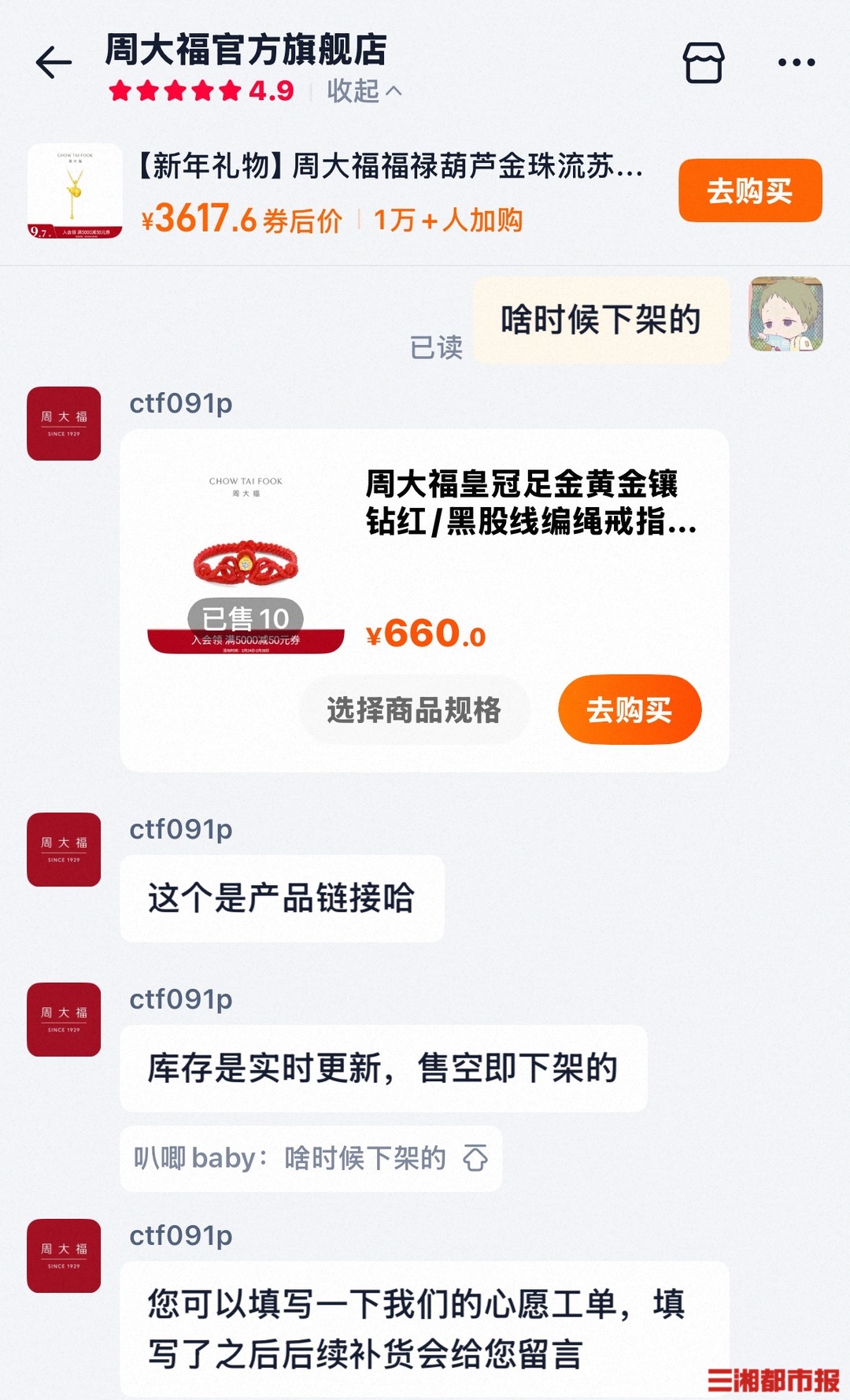 周大福官方旗舰店线上客服确认,该款0.1克编绳戒指已下架,“商品库存实时更新,售空即下架”。客服提供的下架商品链接显示,该款商品累计售出10件。