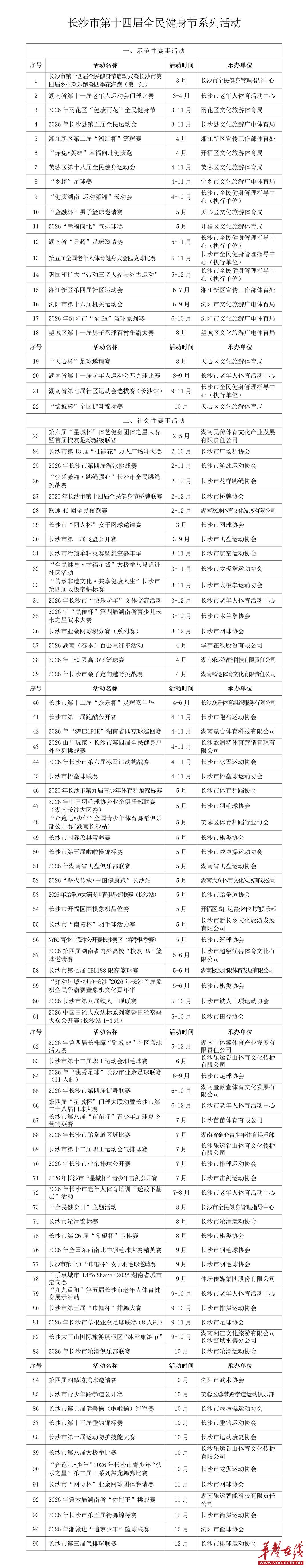 华声在线2月27日讯(全媒体记者 赖泳源)近日,长沙市体育局、长沙市体育总会印发《长沙市第十四届全民健身节系列活动实施方案》,推出2026年度全民健身系列赛事活动。本届全民健身节活动从2026年2月持续到12月,由多部门及相关体育社会组织共同承办,以示范性、社会性赛事为主,95项赛事活动贯穿全年。感兴趣的市民可以留意相关报名信息,一起享受健身运动的乐趣。