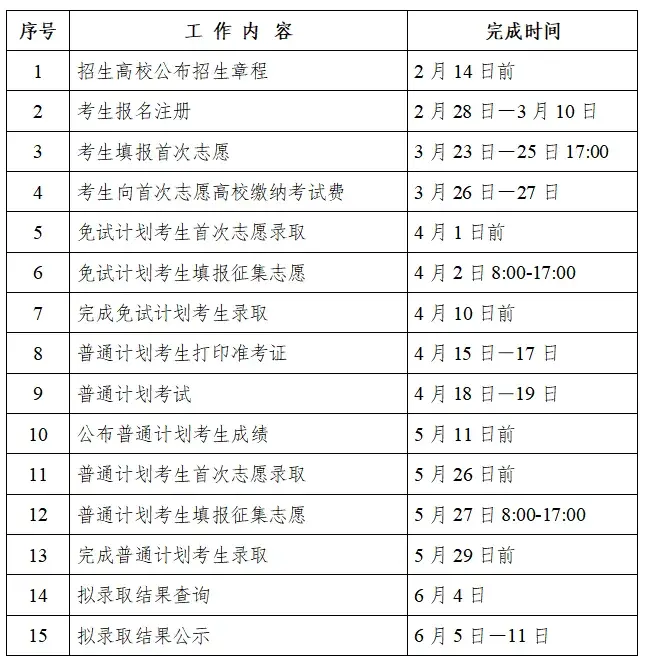 普通计划:5月底前完成,按“分数优先、遵循志愿”投档,同分按语文、数学、英语、专业综合顺序排位。未完成计划可降分征集,降幅不超过20分。