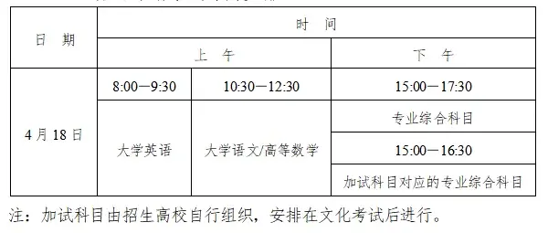 答:考试科目包括2门公共科目(大学语文、高等数学、大学英语中选2门)和1门专业综合科目,部分艺术体育类专业可加试专业技能。考试时间安排如下: