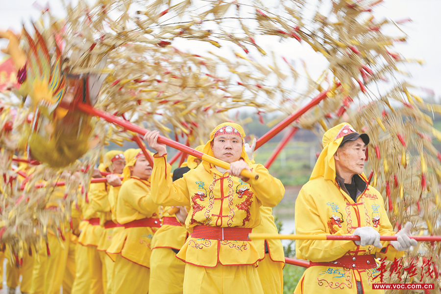 3月1日,衡阳县台源镇台九村,村民舞动稻草龙走村串户。元宵节将至,当地举办民俗巡游活动喜迎佳节。刘欣荣 摄(湖南图片库)