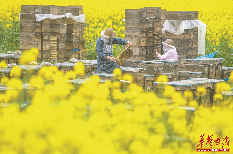 2月28日,道县万家庄街道五洲村,蜂农在管理蜂箱。时下,该村连片油菜花盛开,蜂农在花田边安营扎寨,经营“甜蜜”事业。