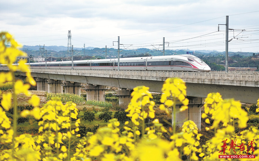 3月3日,列车行驶在张吉怀高铁麻阳苗族自治县岩门镇段,与沿线盛开的油菜花交相辉映,构成春日里一道亮丽的风景。