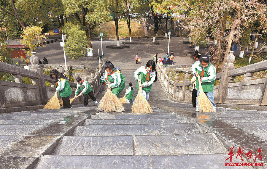 3月5日,吉首市峒河街道向阳社区,光明小学学生在清扫垃圾。当天是学雷锋纪念日,湘西州各地开展形式多样的活动,传承雷锋精神,弘扬时代新风。