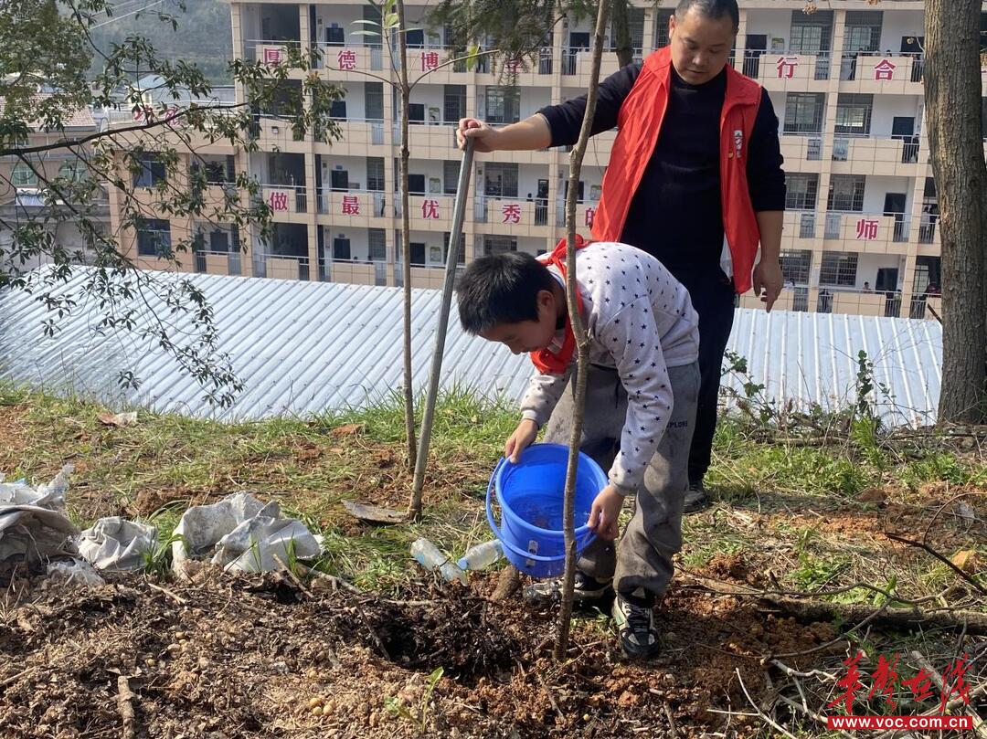 活动现场,党员教师们率先垂范,挥锹挖坑、扶苗培土,为孩子们示范植树要领。少先队员们热情高涨,分工协作,有的挖土培苗,有的提水浇灌,有的为新栽的小树系上心愿卡,稚嫩的童声与铁锹碰撞泥土的声响交织成春日最美的乐章。经过一下午的劳动,30株小树苗在校园“希望林”扎根。