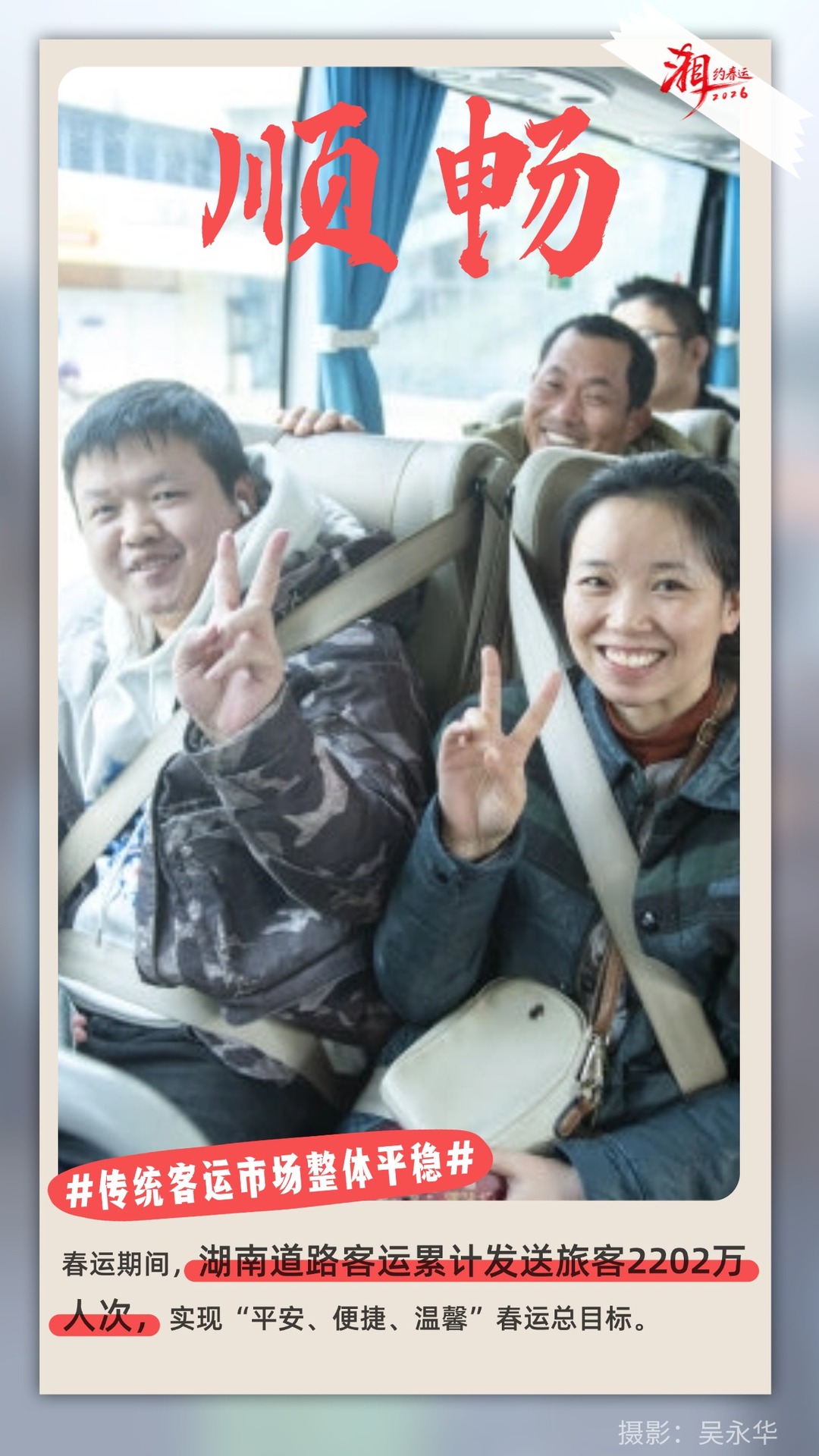 3月13日,2026年春运圆满收官。为期40天的春运过程中,湖南道路客运平安发送旅客2202万人次。全省道路运输市场未发生安全生产责任事故、未出现旅客大规模滞留,圆满实现平安、便捷、温馨春运目标。
