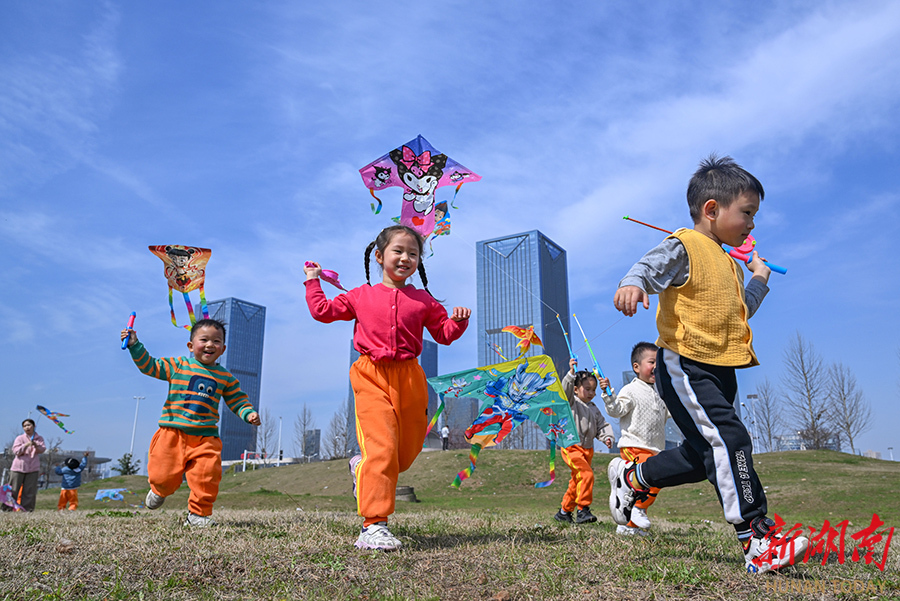 3月13日,长沙市开福区马栏山一处口袋公园,威尔士春天幼儿园的小朋友在放飞风筝。初春时节,市民纷纷走出家门,在户外活动中感受春日气息。华声在线全媒体记者 郭立亮 摄