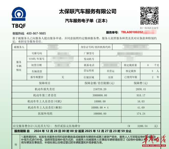 今年1月,江苏的金先生接到自称“湖南太保联汽车服务有限公司”(以下称“太保联”)工作人员的车险推销电话,对方声称太保联是太平洋保险旗下子公司,还报出了金先生的身份证号码、车牌号、车架号等信息。由于对方车险报价比正常价低近一半,金先生便通过二维码支付了3930.27元车险款。这名工作人员称,该费用包含2980.27元商业险和950元交强险,并在1月24日给金先生出具了一份“太保联汽车服务有限公司汽车服务电子单”。