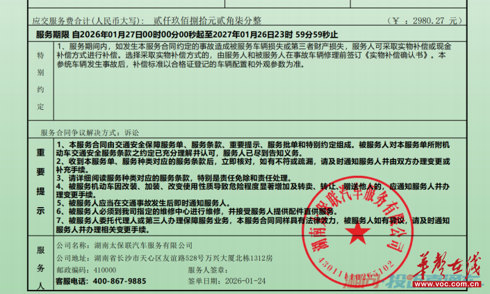 但该公司在2026年1月24日给金先生开具的电子单上,仍写着“湖南太保联汽车服务有限公司”名称,并盖有红色印章,且电子单上清楚地注明了“机动车损失责任”“机动车第三者责任”“机动车车上人员责任(司机、乘客)”“医保外用药”等保障金额、保障费条款,与保险公司出具的正式保险单极其相似,很难区分。