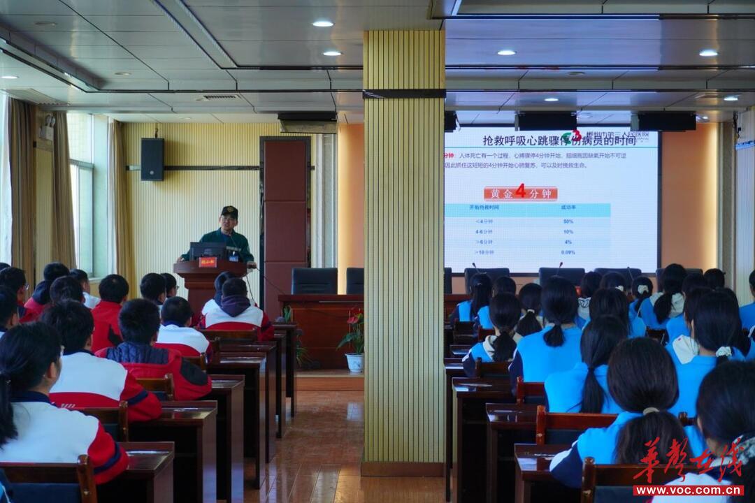 随后,市第三人民医院急诊、120急救中心科主任张小松医生带来关爱生命“救”在身边主题分享,聚焦危急关头的“黄金4分钟”,系统讲解心肺复苏的操作要领、动作规范和注意事项,同时结合学生日常生活场景,重点普及海姆立克急救法的适用情况与操作流程。讲解过程中,张医生通过现场演示、互动提问的方式,让抽象的急救知识变得直观易懂;实操环节,他邀请学生上台模拟演练,手把手纠正操作动作,一对一指导技巧要领,让学生在亲身体验中快速掌握急救技能,真正实现“学懂、弄通、会用”,为生命安全筑牢防护屏障。