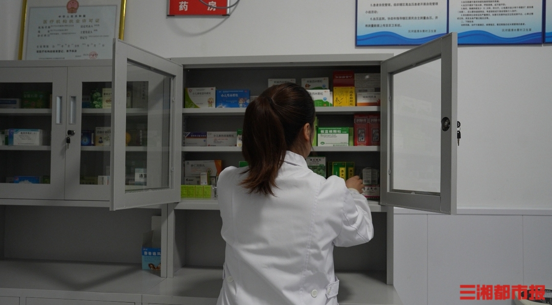 怀化洪江市沅河镇清水青村村医在整理药柜。