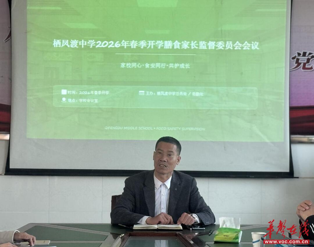 华声在线3月19日讯 (通讯员陈影)3月17日,郴州市苏仙区栖凤渡中学以“家校同心・食安同行・共护成长”为主题,召开膳食家长监督委员会专题会议。学校分管后勤副校长曹礼民,服务部主任廖前进,食堂管理相关负责人,膳食家长监督委员会成员及教师代表参会,共商校园膳食管理与食品安全工作。