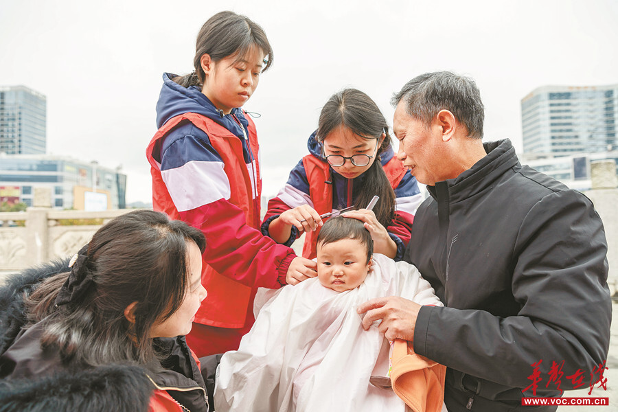 3月20日,吉首市世纪广场,志愿者在为小朋友理发。