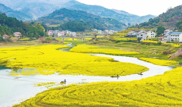 3月21日,辰溪县长田湾镇水库岸边,金黄的油菜花田与湖光山色构成春日田园画卷。田敏 摄(湖南图片库)