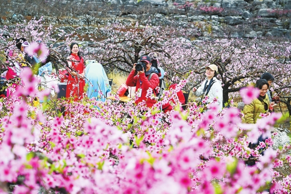 3月21日,摄影师和游客在江永县兰溪瑶族乡香花井村桃花谷赏花采风、定格春光。华声在线全媒体记者 郭立亮 摄