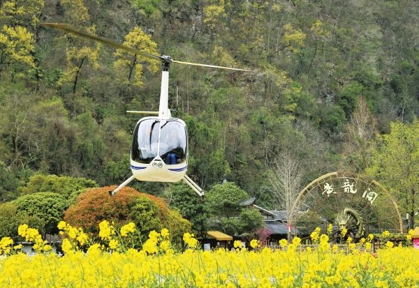 3月21日,张家界市武陵源区黄龙洞景区,游客乘小型直升机观赏花海美景。吴勇兵 摄(湖南图片库)