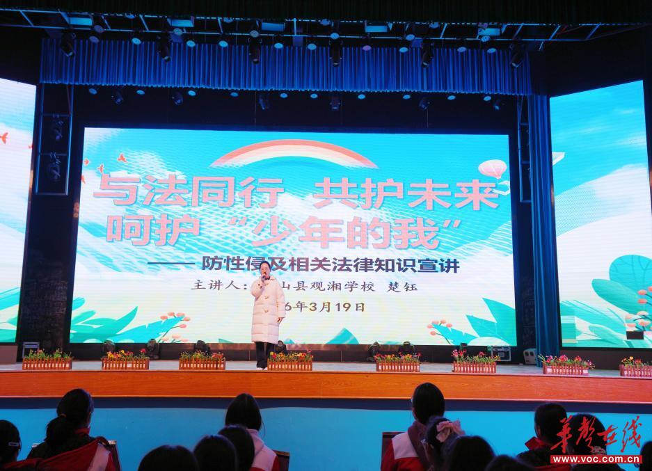 华声在线3月24日讯(通讯员 李敏 赵芬)护航青春,守护成长。为强化七年级女生安全防范意识,提升自我保护能力,筑牢校园安全防线,3月19日,衡山县观湘学校在体艺馆举办“防性侵、反霸凌”及法律安全知识专题讲座,全体七年级女生参加。