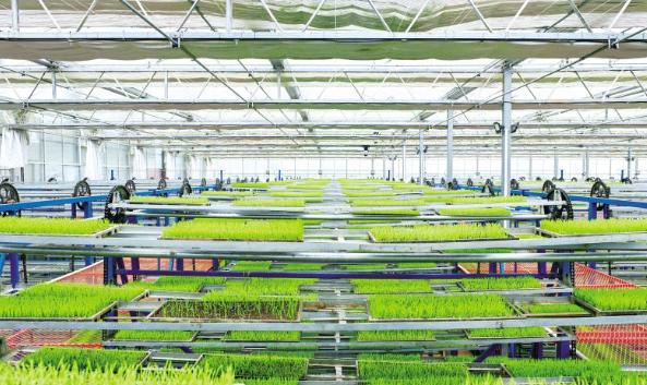 在春华镇智能化育秧工厂的循环立体育秧床上,一盘盘秧苗绿意盎然、长势喜人。图/刘思源