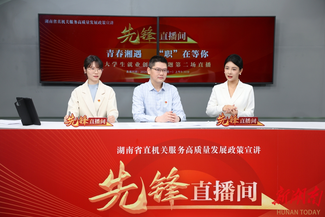“先锋直播间”大学生就业创业专题第二场直播中,省国资委企业队伍建设处副处长周向谦(中)介绍“英培计划”有关情况。