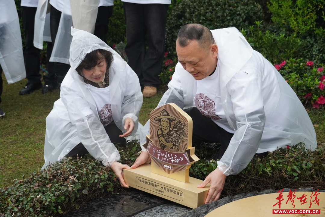 袁隆平院士秘书、湖南省袁隆平农业科技奖励基金会秘书长辛业芸,与“爷爷的水稻田”公益项目发起人、中国作物学会特用作物专业委员会会长曾松亭,一同在雨中稳稳地立起了崭新的“爷爷的水稻田”标识牌。
