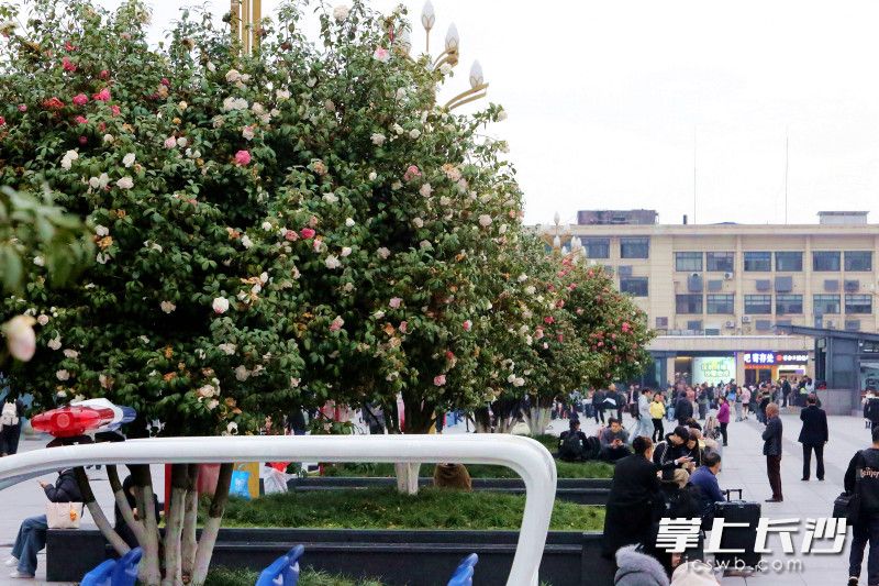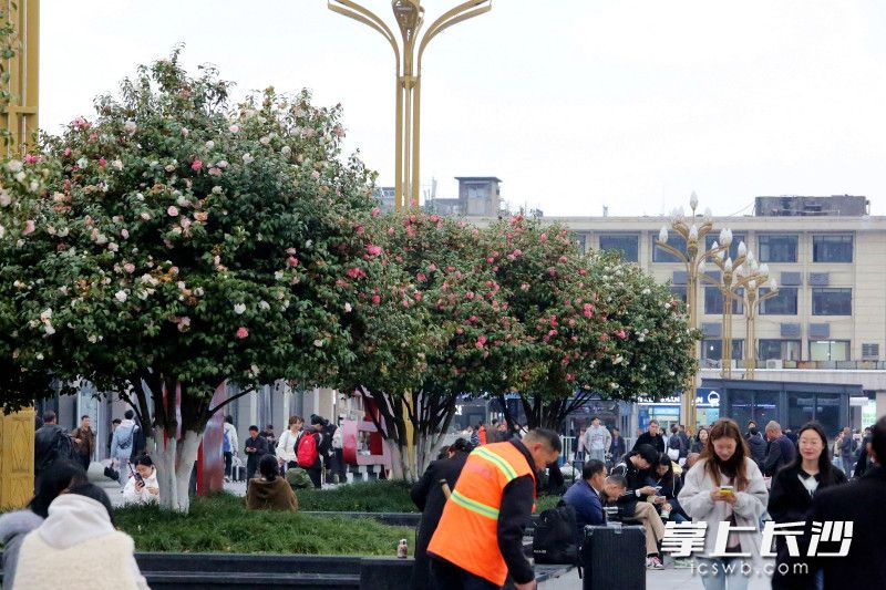 作为城市门户,长沙火车站是众多游客抵达长沙的第一站。眼下火车站广场绽放的山茶花,让旅客出站便见花,旅途的疲惫也悄然消散。有人停下脚步,拿出手机定格这份春日美好,记录下与长沙的初遇瞬间。
