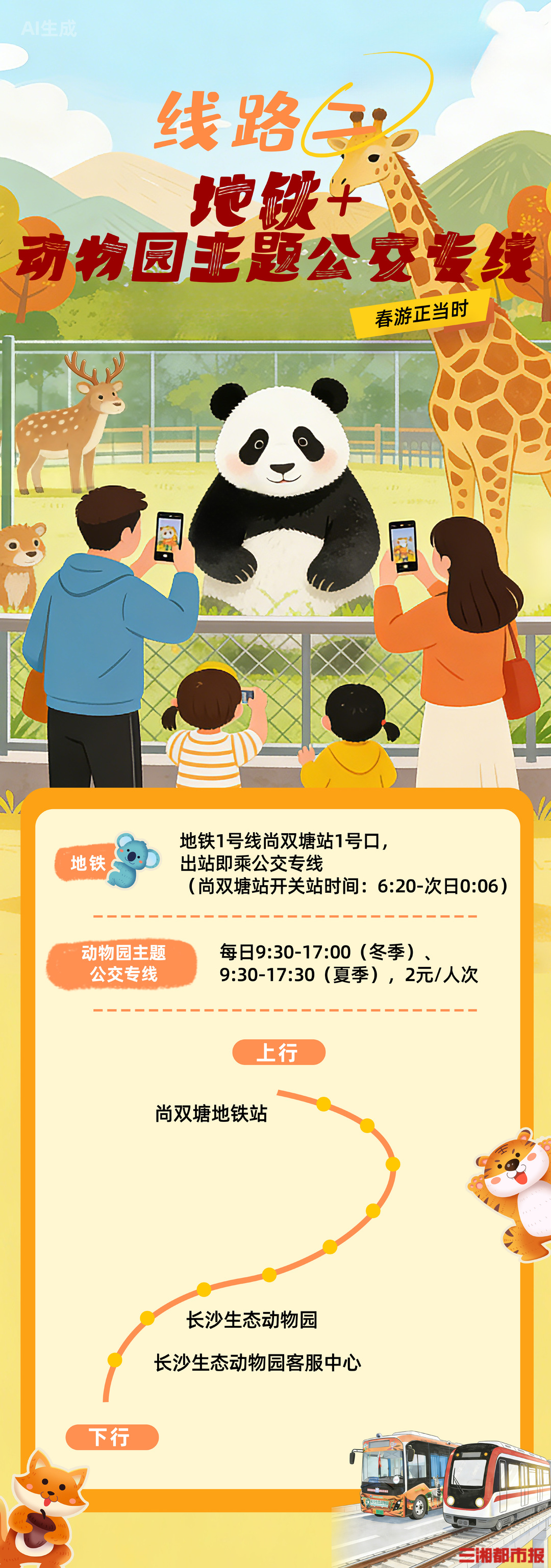 针对亲子家庭的出行需求,动物园主题公交专线应运而生,该专线接驳地铁1号线尚双塘站1号口(开关站时间6:20—次日0:06),为日常运营线路,票价2元/人次。运营时间按季节调整,冬季9:30—17:00、夏季9:30—17:30,专线直达长沙生态动物园大门及客服中心。