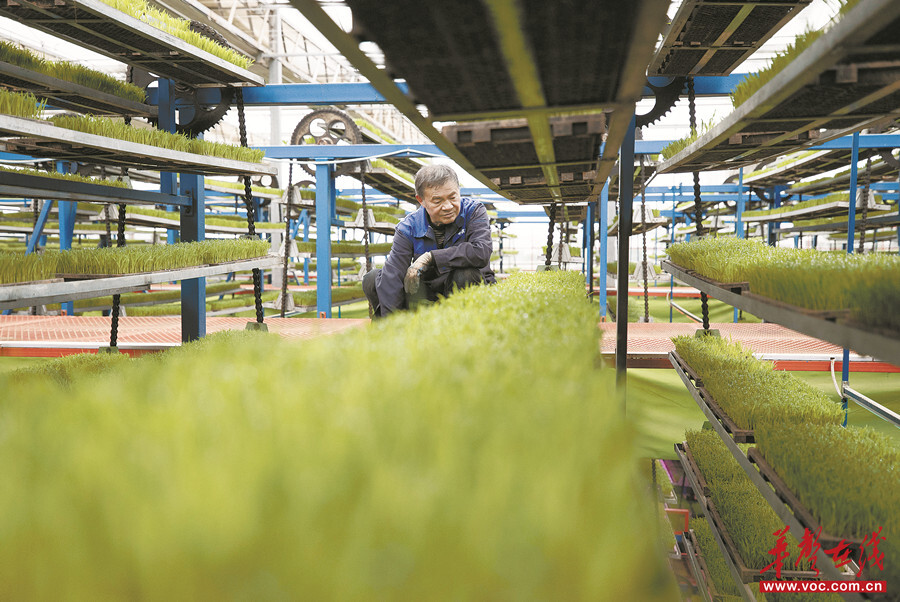 4月2日,长沙县春华镇智能化育秧工厂,工作人员在管护早稻秧苗。