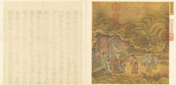 取材于唐人小说“柳毅传书”的情节,为龙王率众侍从出门迎请柳毅的画面。