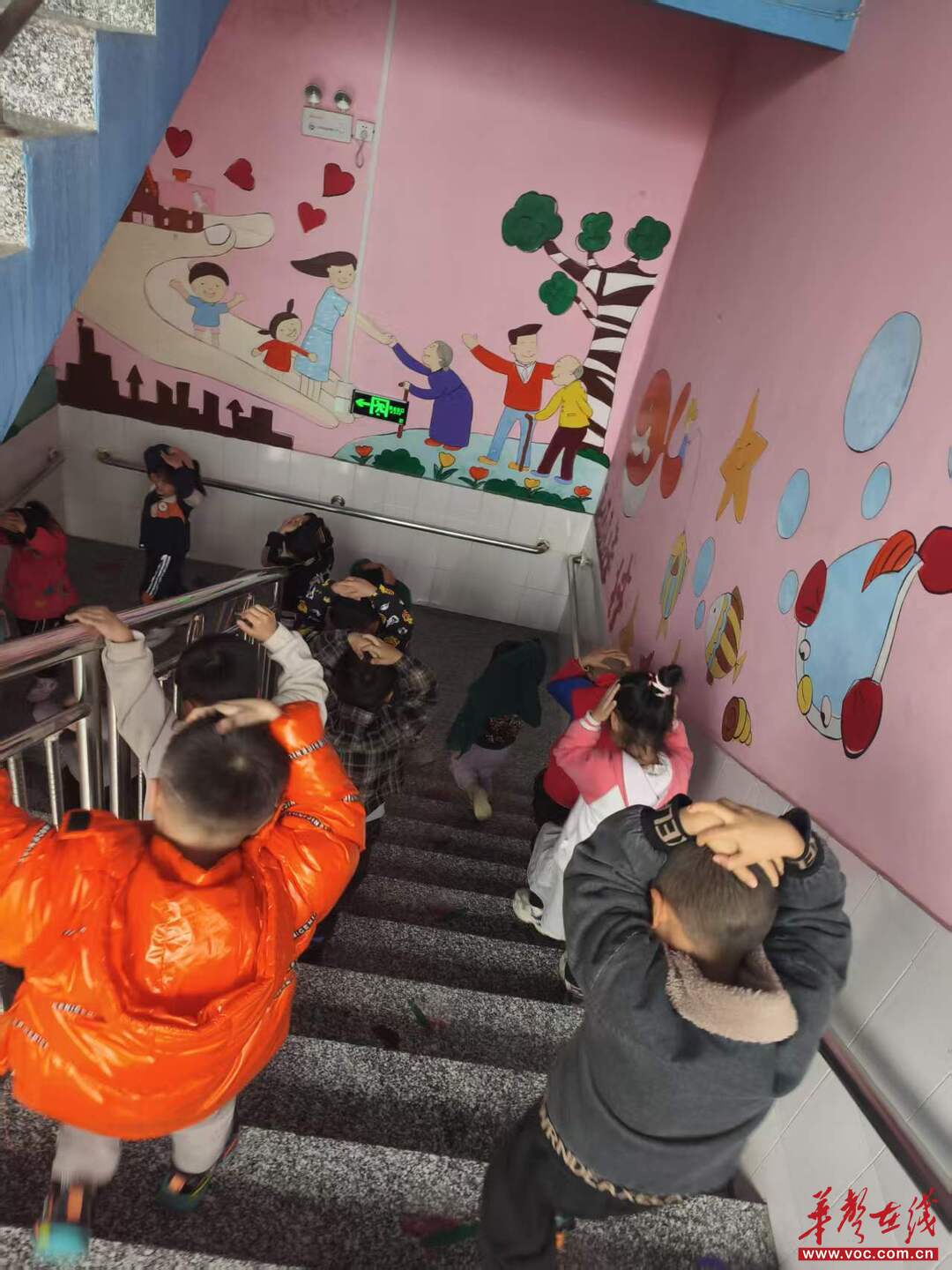 警报解除后,二楼班级幼儿在教师组织下,抱头、弯腰,沿楼梯两列队形有序疏散。各楼梯口、拐角处均有教师引导,严防推拉、拥挤。