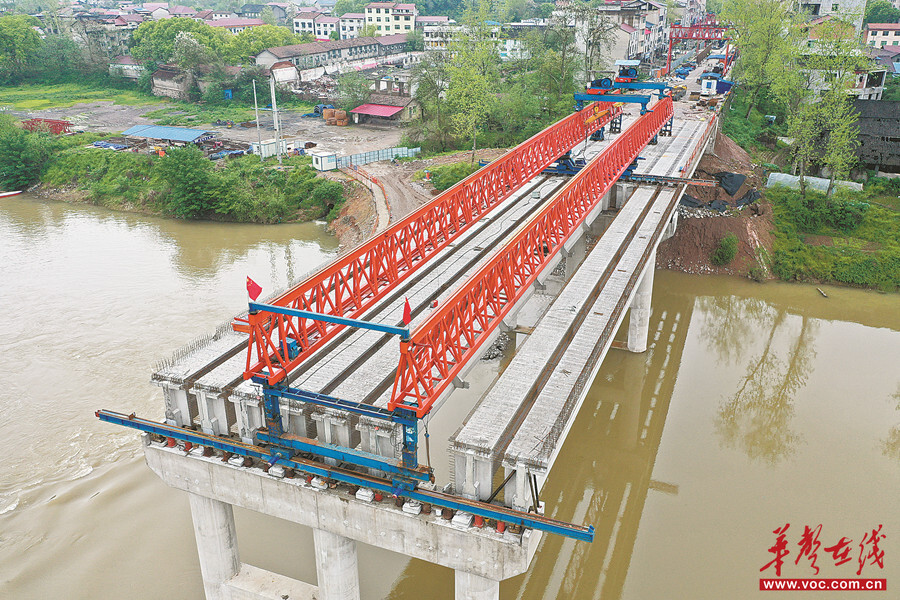 4月15日,国道G354辰溪县辰水二桥拆除重建工程建设现场,工人在进行桥面铺设施工。 原桥存在安全隐患,去年9月启动原址重建。目前,桥梁下部结构已全面完成,工程建设进入最后冲刺阶段,预计8月底通车。