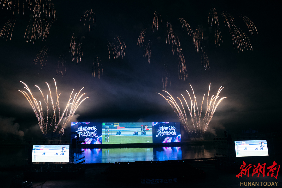 华声在线4月18日讯(全媒体记者 王文 易昂 杨子洋)4月18日晚,2026年浏阳周末焰火秀第五场活动在天空剧院精彩上演。本场焰火秀以“勇敢追梦·不止72变”为主题,浏阳特色璀璨焰火携手世界超级摩托车锦标赛(WSBK)夺冠团队张雪机车同台联动,浪漫焰火邂逅赛道激情,现场人气高涨,氛围感十足。