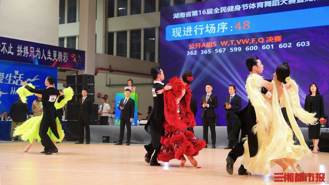 华声在线4月26日讯(全媒体记者 叶竹 通讯员 廖玉倩)来自三湘四水的近800名体育舞蹈爱好者齐聚“洞庭之心”,带来华尔兹、探戈、伦巴、桑巴等舞种的精彩对决,点燃全民运动热情,4月25日至26日,“潮涌大通湖 运动新潇湘”湖南省第十六届全民健身节暨体育舞蹈大赛在益阳市大通湖区文体中心举行。